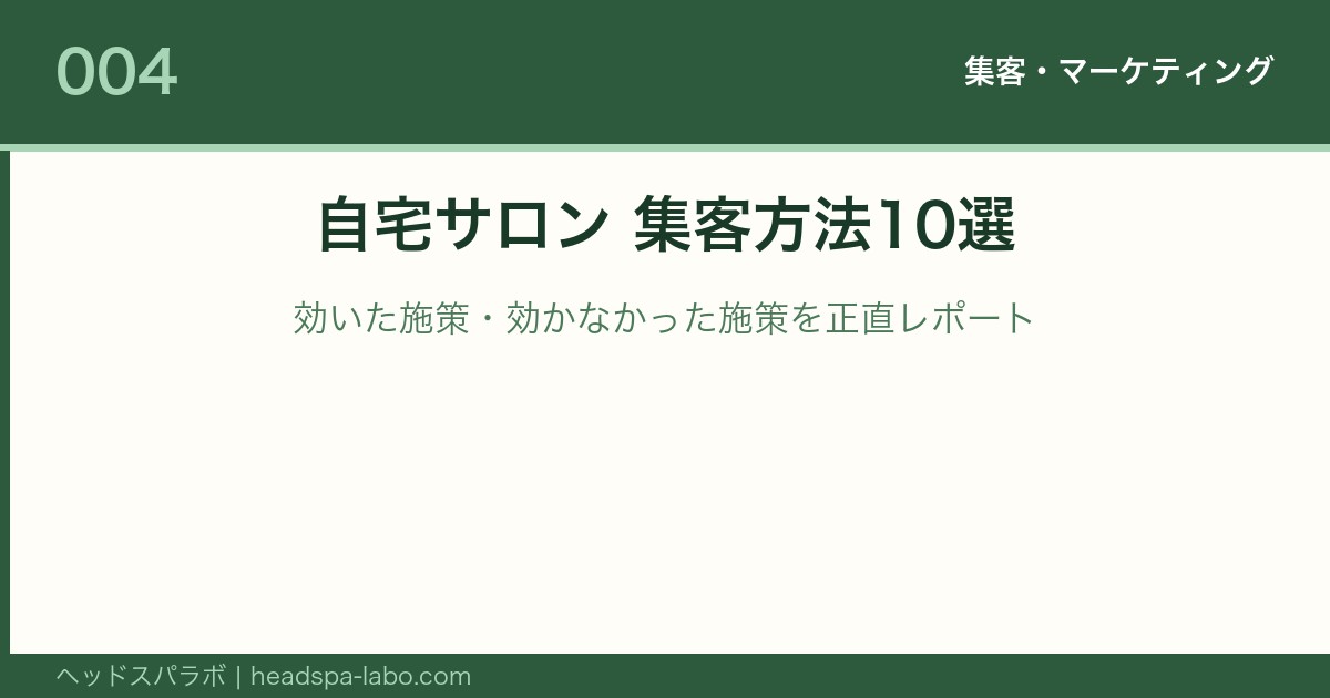 この記事では、私たちが実際に試してきた集客方法を10個、正直にレビューします。「やってよかった」だけでなく、「やったけど効果がなかった」「失敗した」ことも包み隠さず書きます。同じ轍を踏んでほしくないからです。自宅サロンの集客には、店舗型とは違う戦略が必要です。