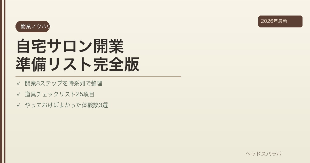 この記事では、そうした実体験をもとに、**自宅ドライヘッドスパサロンの開業準備を8つのステップに整理**しました。道具のチェックリスト(25項目)、開業前の最終確認リスト(20項目)、やっておけばよかった体験談まで、一記事で完結するように書いています。